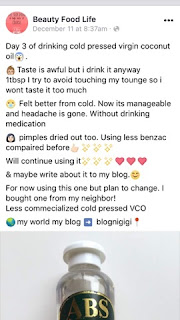 In my case I want to treat my acne, however, I still notice a couple of red bumps near my ears which translates ‘it is not effective’, but I somehow have trust with my neighbour's testament that it helps clears up acne. So I will continue using VCO and update you again. (by the way, I think it is my day 7 or day 8 in drinking VCO and this redness near my ears is just recent. I do post update on my Facebook page about the effects of VCO on my skin and that is of course with constant use of Benzac- screenshots below)
